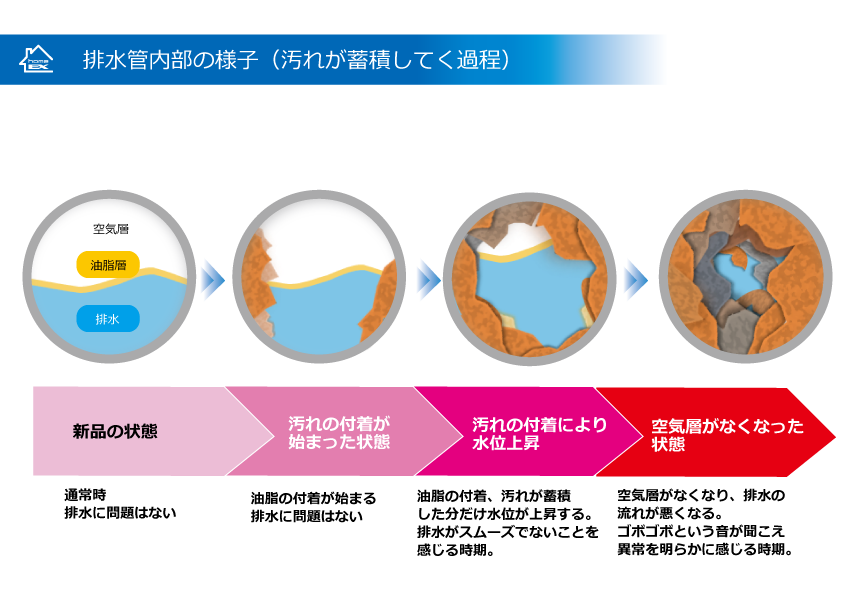 汚れたり詰まった状態の排水管の内容物を分析してみますと、油脂分と有機物がほとんどを占めており、この付着物に細菌、真菌、原虫などの微生物が増殖し、発酵することにより悪臭が発生します。