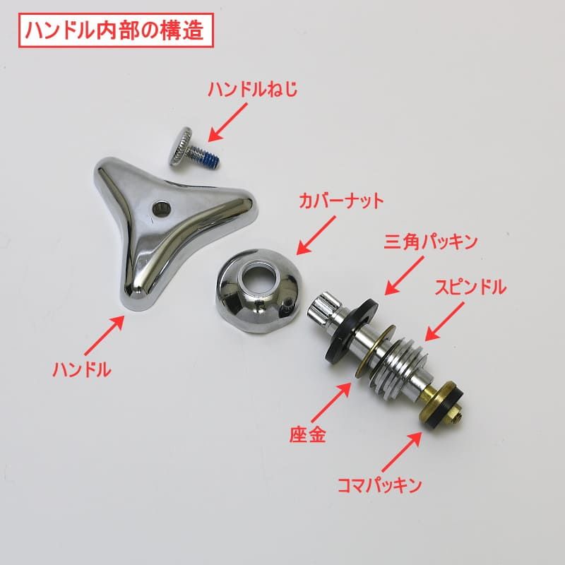 | ハンドル下部 | ケレップ/Uパッキン | ハンドル操作による止水 |