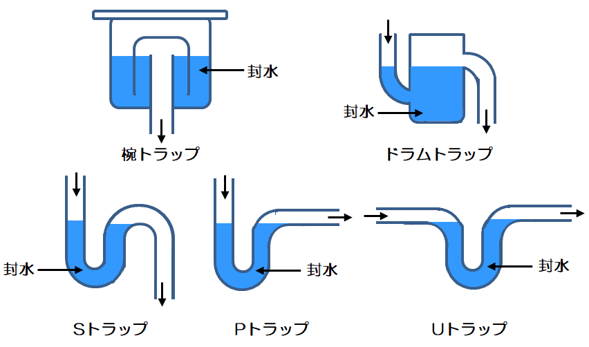 もっと詳しく知りたい方は「排水 トラップ 種類」で画像検索してみて下さい。形も分かるので、納得できるかと思います。